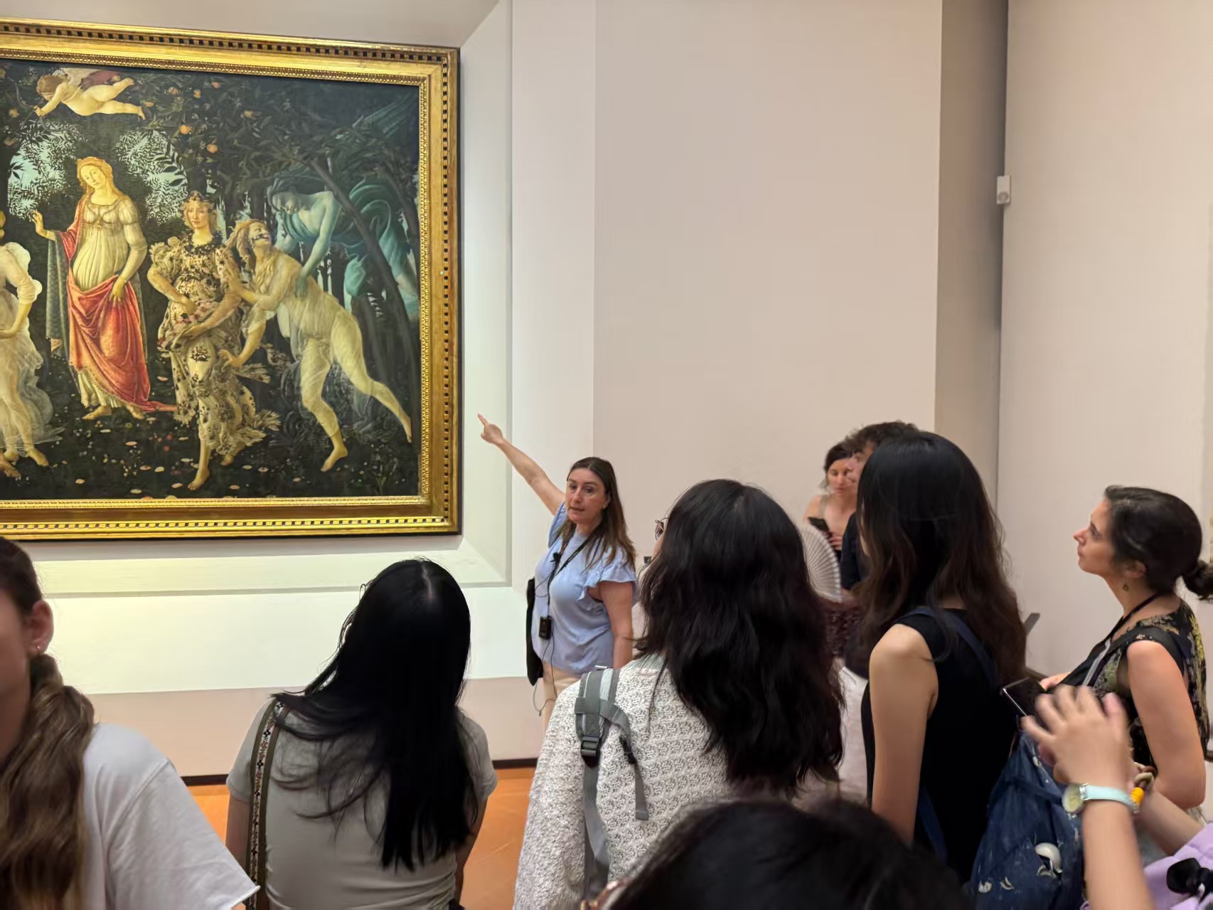 在佛罗伦萨,同学们步入新圣母玛利亚教堂和圣母百花大教堂,在彩窗与壁画的交织中领略意大利建筑魅力。在乌菲兹美术馆内,波提切利的《春》与《维纳斯的诞生》以细腻笔触吸引同学们纷纷驻足;在大卫像前,同学们不仅惊叹于米开朗基罗的鬼斧神工,更感受到文艺复兴精神对当代审美的深远影响。