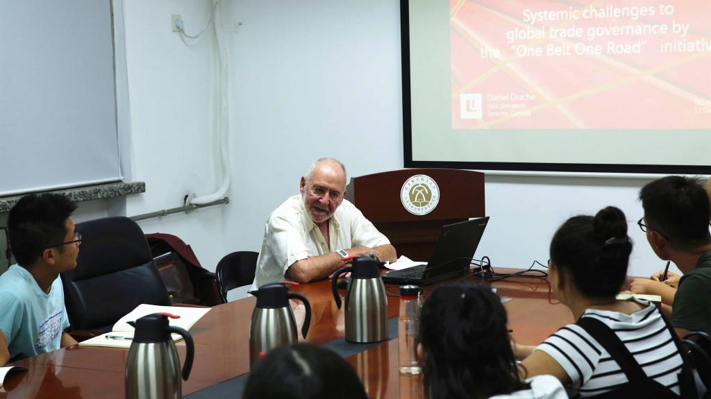 Daniel Drache教授随后在西办公楼105高研学术坊为人文与社会科学高等研究院、人文社会科学学院部分本科生、研究生作了题为“One Road Many Dreams”的主题报告,他分别从“一带一路”项目的意义和沿线国家基础设施建设的必要性两个方面阐述了“一带一路”国际影响力和意义。